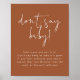 Dieses "Don't say baby"-Schild zeichnet sich durch einen edlen handgeschriebenen Schriftart und ein modernes minimalistisches Design mit einer boho terracotta-weißen Farbkombination aus. Ändern Sie einfach die Schriftart- und Hintergrundfarbe, um sie Ihrem Veranstaltungsstil anzupassen. Pair mit weiteren Artikeln aus der INDIE Collection für ein einheitliches Aussehen.