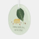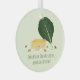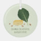 Ein Weihnachtsschmuck, der einen Cornbread-Charakter und einen schwarzen grünen Blattcharakter zeigt, die beide lächeln, während sie von Erbsen mit schwarzem Auge umgeben sind. Die Wörter sind anpassbar. Cornbread Collard Grüntöne Black Eye Peas Food Glass Ornament Sweetsham Food Art | ©Melissa Patton - Künstler/Illustrator