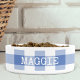 Diese personalisierte Hundeschüssel hat ein blaues und weißes Gingham Karo kariertes Muster mit dem Namen Ihres Hundes in einem weißen Retro-SchreibmaschinenSchriftart. Das perfekte Begleiter-Accessoire, das sich perfekt in die Bauerndekoration passt.