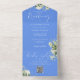Alles in einer Hochzeitseinladung mit botanischen grünen rustikalen Blätter und eleganter Typografie auf einem kornblumenblauen Hintergrund. Die Einladung enthält eine perforierte RSVP-Karte mit QR-Code. Entwickelt von Thisisnotme©