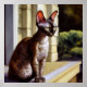 Katzen leben seit Jahrtausenden mit dem Menschen zusammen. Zeigen Sie der Welt Ihre Leidenschaft für Katzen mit diesem Portrait eines Cornisch Rex auf einer Veranda. Ideal für alle Katzenliebhaber da draußen.