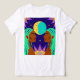 At the center, a prominent moon dominates the composition, with a striking half-yellow, half-cyan appearance, hinting at phases or the interplay of light and shadow. Above and below, stylized sun motifs in purple and orange further emphasize the cosmic theme of duality—day and night, light and dark, masculine and feminine energies. The dark blue background, dotted with stars, reinforces the celestial setting.