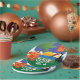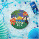 Costa Rica Illustration nach dem Vintage Reisestil Plakate der Vergangenheit modelliert. Das tropische Bild in lebhaften Farben ist mit einem Sonnenuntergang über dem Ozean, einer Palme, Blume an Hibisken und einem Toucan ausgestattet.