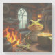 In diesem Untersetzer befindet sich ein Frosch, der am Feuer Kaffee trinkt.