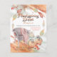 Ein Erntedank Dinner Einladung Postkarte mit einem eleganten Aquarell in Herbstfarben mit einem Kranz von Blätter ein gemütlicher Stuhl und Decken neben Kürbissen, Äpfeln und Beeren. Erntedank Dinner ist Set in einer eleganten zwei Töne Schrift Typografie und die Erholung des Textes ist leicht mit eigenen Party-Details personalisiert.