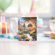 This enchanting artwork captures a dreamy cottage garden bathed in the golden glow of sunset, where colorful blooms and tall foxgloves line a gentle stream that winds past cozy houses and old wooden bridges. A large tree anchors the scene, its sprawling branches casting dappled shadows over the vibrant flowerbeds bursting with lupines, peonies, and wildflowers. Warm lights twinkle along the path, creating a soft, magical ambiance that feels both nostalgic and serene. The pastel tones, painterly brushstrokes, and whimsical composition give the piece a timeless, cottagecore charm—perfect for evoking the peace and poetry of slow-living landscapes. AI generated artwork.