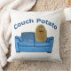 Hübscher Kartoffelcharakter auf einem blauen Sofa mit Couch Potato-Formulierung wirft Kissen für diejenigen, die gerne auskühlen.