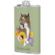 Ein Cumarportrait mit wilden Blume. Die Puma und die Blume werden in einem Tätowierstil gezeichnet, in einer Umgebung von Olivenbäumen.