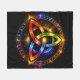 Symbole triquetra lumineux aux couleurs arc-en-ciel, entouré d’un cercle mystique orné de glyphes ésotériques, sur fond cosmique étoilé.