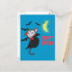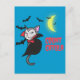 Niedliche Halloween Postkarte mit einer Aquarellkunst einer Dracula-Katze mit roter Bogen-Krawatte und schwarzem Kap mit Fledermäusen im Hintergrund. Es gibt auch einen leuchtenden Halbmond. Der spöttische Schriftart sagt "Graf Catula".
