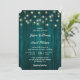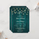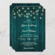 Land aquamarine Hochzeitseinladung mit Saitenleuchten vor einem Stallholzhintergrund. Die perfekte Kartengestaltung für Ihre aquamarine rustikale Land-, Garten-, Garten-, Freien- oder Scheunenhochzeit. Matching-Elemente verfügbar.