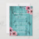 Chic, rustikales aquamarines blaues Holz und rosafarbene Blume, Brautgetränke, Einladungen für Hochzeitsstile auf dem Lande - Reads Bitte schließen Sie sich uns an für einen mit Bridal Luncheon oben in Weiß mit einem aquamarinen Tropfschatten. Alte, verwitterte aquamarine Stallholzplatten mit Blick auf den Hintergrund. Die Blume in den oberen und unteren Ecken sind mit Blütenrot und Rosa verziert. Personalisiert mit Ehrengast mit Schlagschatten. Eine elegante, türkisblaue Metallic-Effekt-Scrolllinie trennt den Namen der Braut vom Brautparty. Die personalisierten Brautparty-Informationen, einschließlich UAWG und Registerdaten, werden in modernem, weißem Schriftsatz gedruckt. Zurück hat passende, elegante Imitat türkisfarbene Konfetti-Punkte Rand oben und unten auf einem aquamarinen blau-grünen Hintergrund. Country chic aquamariner Polterabend lädt ein, sich mit Ihren eigenen Brautwäsche-Duschdetails personalisiert zu fühlen. Ergänzt werden die blumengeschmückten Hochzeiten, die blumenreichen Hochzeitsthemen und die rustikale, rosa und aquamarine Hochzeitsdekoration.