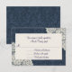 Chic Hochzeit RSVP Antwortkarte in einem blauen auf blauem Denim Blumen Damast Muster getan. Die Grafiken der eleganten, aus Elfenbein gefertigten Doilien schmücken die links Ecken oben rechts und unten. Die Rückseite der Karte wird im gleichen blauen Denim-Damast-Muster ausgeführt. Die passenden Hochzeitsprodukte sind erhältlich.