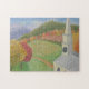 Dieses einzigartige Puzzle zeigt ein Gemälde von Marjorie Tietjen. Man kann sich vorstellen, in einem Traum über die Kirche und die Landschaft zu fliegen.