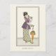 Eine Postkarte mit der französischen Mode Vintage Illustration aus dem Jahr 1912, Robe de Campagne (Country Dress). Eine Frau, die sich auf einen Sonnenschirm in einer lila, plissierten Jacke und einem blühenden Rock stützt. Ein digital verändertes und erweitertes Bild aus dem Journal des Dames.