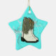 Country Cowgirl Stiefel Weihnachtsbaumschmuck. Originelles Kunstwerk Design auf hübschem Aquablau platziert. Ein blättriger blüh vervollständigt das Bild auf einem sternförmigen Ornament.