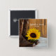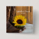Passen Sie den charmanten Country Sunflower Wedding Button mit den persönlichen Namen der Braut und Bräutigam und Heiratstermine an, um den Neuvermählten oder dem Gastgeschenk für die Gäste ein Sake-Geschenk zu machen. Dieser hübsche, rustikale und schicke Button-Backknopf zeigt ein malerisches Blumenfoto mit braunen Lederkuschelstiefeln, gelben Sonnenblumen und Stallholz auf weißem Satin.