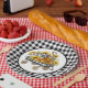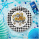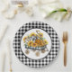 Eine wunderschöne schwarz-weiße Gingham-Musterplatte mit Vintagem Spielzeugwagen mit Sonnenblumen und Kürbiskins.