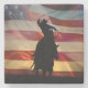 Ein Western patriotischen Cowboy Untersetzer eines Seilers und sein Pferd jagen eine Führung mit einer großen amerikanischen Fahne im Hintergrund.