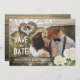 Rustikale Country Style Wedding Save the Date FOTO Card Vorlagen - Verwandtes Horseshoe Herz mit Rope Bow Knot und White Lace, Hydrangea Blume, String Lights und Burlap Tuch auf dem alten Stall Holz Hintergrund. Ein perfektes Design für Ihren großen Tag. Alle Textstile, Farben, Größen können an Ihre Bedürfnisse angepasst werden!