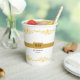 Diese elegante, goldene Tasse mit Dekoration besticht durch ein schlichtes goldenes Textdesign, das minimalistisch wirkt. Fügen Sie Ihre Initialen oder Monogramm, Ihren Nachnamen und Ihr Hochzeitstermin oder ein anderes spezielles Datum hinzu, um sie komplett zu Ihrem eigenen zu machen.