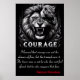 Dieses kontrastreiche Schwarz-Weiß-Bild zeigt den Triumph über die Angst. Ein heftiger Löwe brüllt, seine Zähne kratzen in einem Schaufenster des Powers, während ein kleiner Tigerjungen spielerisch auf den Rücken klettert. Der dunkle Hintergrund betont die Themen. Darunter befindet sich eine stilvolle Textbox mit "Courage" in fett und elegant rotem Schriftart. Nelson Mandelas Zitat fügt Bedeutung hinzu: "Ich habe gelernt, dass Mut nicht die Abwesenheit von Angst war, sondern der Triumph darüber. Der tapfere Mann ist nicht der, der keine Angst empfindet, sondern der, der diese Angst erobert." Das Bild verkörpert Stärke und Tapferkeit.
