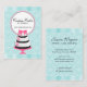 © Persönlichkeit des öffentlichen Lebens-Entwürfe 2014. Eine Couture backen Bäckereigeschäftskarte mit eleganter Wirbel und Blumender kuchenentwurf zusammen, überstiegen mit einem rosa Band. Der Hintergrund hat ein schönes Türkisdamast- und -streifenmuster.