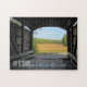 Genießen Sie Stunden mit diesem Rätsel mit einem landschaftlichen Foto eines sonnigen Feldes, das durch eine alte überdachte Brücke in Indiana schaut. Das inspirierende Zitat besagt: "Das Leben ist Kurz und die Welt ist breit."