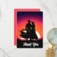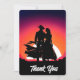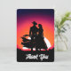 A cowboy and his bride are silhouetted against a beautiful sunset.