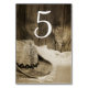 Passen Sie diese bezaubernden Cowboy-Hut- und Barnholz-Country-Hochzeitsreisen an und erstellen Sie für jeden Tisch im Brautparty Ihres Ehe-Empfangs oder Stall-Party eine andere Karte. Fühlen Sie sich frei, um Text hinzuzufügen oder den Schriftart zu ändern, um Anzug Ihrer Veranstaltung benötigt. Dieses rustikale schicke Design ist perfekt für einen lässigen und dennoch eleganten Landhausstil, rustikale Scheune oder Western Hochzeit oder Party Thema. Diese Tischnummer-Karten sind mit einem klassischen, digital verbesserten Schwarz-Weiß-Sepia-Ton-Foto eines Cowboyhutes, einem weißen Bridalschleier und einem Vintagen Leinentaschentuch aus Spitzenholz mit einem Bruch und verwittertem Stallholzhintergrund versehen.