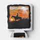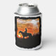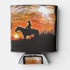 Die Silhouette eines Rändeljungen auf seinem Pferd mit einem wunderschönen orangefarbenen Sonnenuntergang im Hintergrund.