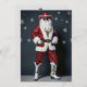 Santa is dressed in a red cowboy costume with white fur trim and boots. He stands confidently against a dark backdrop with decorative snowflakes.