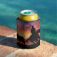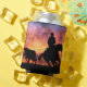 Cowboy, der in einem sehr coolen südwestlichen Sonnenuntergang von seinem Pferd abseilt. Eine gemütliche Tasse Western auf dem Lande.