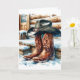 Weihnachtskarte, die eine Aquarellbilder von Cowboystiefeln und einen Cowboyhut auf den vorderen Stufen einer Blockhütte an einem schneebedeckten Wintertag darstellt.