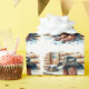 Weihnachtsgeschenkpackung mit einer Aquarellbilder von Cowboystiefeln und einem Cowboyhut auf den vorderen Stufen einer Blockhütte an einem schneebedeckten Wintertag.