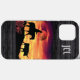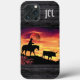 Personalisieren Sie diese einzigartige "One of a Kind" Cowboy und Longhorn Steer iPhone Case! Es verfügt über einen Cowboy, der eine Pferdeherde und eine Langläuferin reitet, während eines wunderschönen orangen Sonnenuntergangs...umgeben von Holzgrenzen! Original Art Design von Kerry Miller.