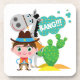 Ein kleiner Cowboy in einem Cowboyhut, in einem grauen lächelnden Pferd, in einem Kaktus des Grüns und im Text, der KNALL auf einem Entwurf liest, der für Kinder groß ist, die Liebe der wilde Westen! Cowboy-T - Shirts, Taschen, Tassen, Karten, Schlüsselketten, mousepads, Kissen und soviel mehr!