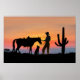 Eine Silhouette eines einsamen Cowboy auf der Prärie, dankbar für seine einzigen Gefährten, ein treues Pferd und sein liebenswerter Haustier Hund, nimmt einen Augenblick in der Zeit, um seine Zuneigung zu zeigen und die Schönheit eines roten Sonnenuntergangs zu genießen.