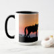 Die Silhouette eines texanischen Cowboys, der sein Pferd und seinen Haustier trödelt, hilft bei Sonnenuntergang Einsamkeit in den Wüstenebenen zu überwinden.