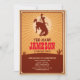 Howdy! Feiern Sie Ihre Geburtstagsfeier mit unserer Cowboy-Foto-Party Einladung. Design zeigt einen Cowboy auf seiner Rodeo-Pferdeillustrierung auf Vintagem braunen Hintergrund. Diese Vintage Western-Party Einladung ist perfekt für Ihre kleine Junge Wild West Geburtstagsparty, Western Baby Dusche Einladungen oder nutzen sie als Cowboy Rodeo Einladungen