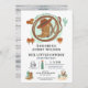Eine niedliche und skurrile Wildwest Cowboy Babydusche in Terrakotta-Braunen und Blues, mit Western-Ausrüstung Cowboy-Ausrüstung und Ranch-Tiere. Sattel, Lenker, Pferde, Kakteen, Sattel und Lasso. Die Rückseite der Einladung hat einen leichten, verwitterten Stallholzeffekt.