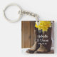 Passen Sie die rustikalen, schick gelben Daffodils und Cowboy Boots Country Western Wedding Square Acryl Schlüsselanhänger mit den persönlichen Namen der Braut und Bräutigam und Ehe Zeremonie Datum. Diese hübsche, individuelle Ranch-Kette im Stil der Brauchtum zeigt ein malerisches Blumenfoto eines braunen Lederkuschelstiefels mit einem Bouquet aus gelben Federodien und einem weißen Brautschleier mit braunem Holzfußboden. Es ist ein einzigartiges personalisiertes Pflichtereignis für Braut und Bräutigam, Brautmädchen oder Hochzeitsbegleiter.