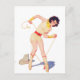 Vintages Button-Up-Bild aus einem klassischen Zeitalter. Ein lustiges, sassy Bild einer Retro-Pinup-Pose. Cowgirl ist in ihren eigenen Schnüren gefangen, während sie versucht, ihre Stiefel Krawatten.