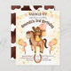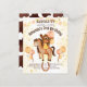 Niedliches kleines braunes Hautschmuddel schnallt sich die Geburtstagsgeschenke. Cowgirl reiten niedliches Babypferd mit Ballons und bunten Fahnen im Hintergrund. Braune, gelbe Farmfarben.