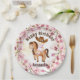 Niedliches kleines Cowgirl satteln Geburtstag personalisierten Party Teller. Cowgirl, die auf niedlichem Kinderpferd und rosa Blume reiten. Braune und rosa gelbe Bauernfarben.