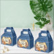 Cowgirl satteln Pferde Western Gastgeschenk Geschenkboxen. Denim Hintergrund, Vintages Etikett mit einem braunen Pferd, Rad, Cowboy Schuhe und Hut.