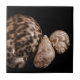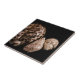 Ein Stillleben Foto von drei gepunkteten Muscheln auf schwarzem Hintergrund.
