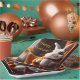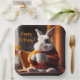Diese Teller aus dem Geburtstagspapier bieten ein gemütliches Hasen, das morgendlichen Kaffee serviert.