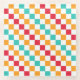 Alternating red, orange, teal, and white squares create a colorful, vibrant checkerboard pattern, conveying an energetic and playful tone.