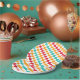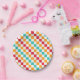 Alternating red, orange, teal, and white squares create a colorful, vibrant checkerboard pattern, conveying an energetic and playful tone.